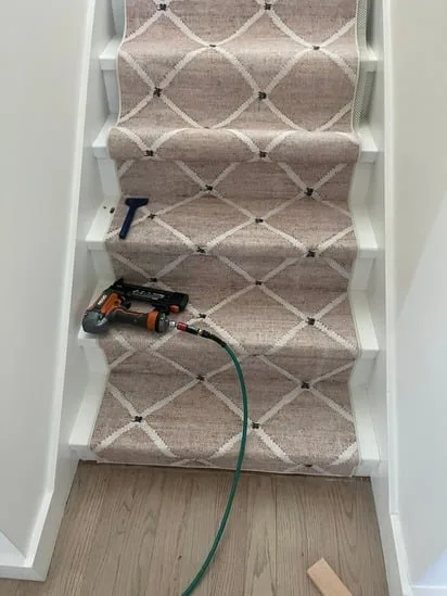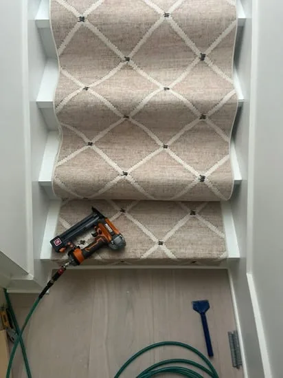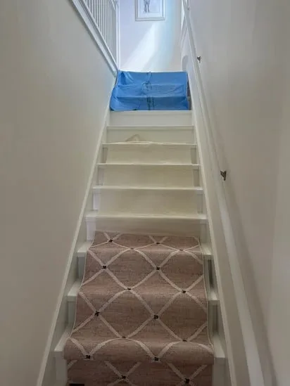 This project involved a stair carpet installation featuring a custom patterned runner carefully fitted to each step. The process began with surface preparation and precise measurements to ensure symmetry throughout the staircase. Moreover, the carpet was secured using professional tools and techniques to achieve a tight, smooth finish while maintaining safety and durability. Additionally, the chosen material not only enhances traction and comfort but also complements the bright white walls and modern design of the interior. The result is a balanced, elegant look that adds warmth and refinement to the space.